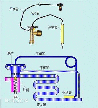 3、感溫包內(nèi)充注制冷劑,放置在蒸發(fā)器出口管道上,感溫包和膜片上部通過毛細(xì)管相連,感受蒸發(fā)器出口制冷劑溫度,膜片下面感受到的是蒸發(fā)器出口壓力。如果空調(diào)負(fù)荷增加,液壓制冷劑在蒸發(fā)器提前蒸發(fā)完畢,則蒸發(fā)器出口制冷劑溫度將升高,膜片上壓力增大,推動閥桿使膨脹閥開度增大,進(jìn)入到蒸發(fā)器中的制冷劑流量增加,制冷量增大;