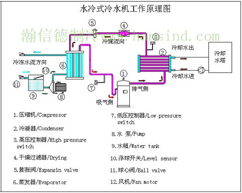 • 2、下面提供一張高清大圖工作原理圖,有了這張圖大家再配合上面的工作原理介紹,就可以很清楚的了解啦,箱式水冷冷水機(jī)的工作原理圖如下: